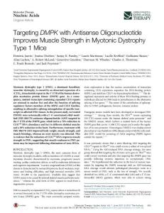 targeting dmpk with antisense oligonucleotide improves muscle strength in myotonic dystrophy type 1 mice.[2017][mol ther nucleic acids][10.1016j.om